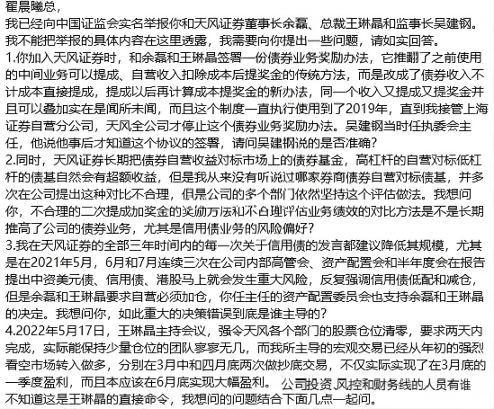 2023年8月,已身在纽约的郭胜北,在社交平台发布《八问天风证券原常务副总裁翟晨曦》长文,以“檄文”形式实名举报天风证券时任董事长余磊、总裁王琳晶、常务副总裁翟晨曦、监事长吴建钢四名核心董监高。